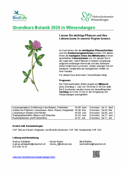Im Kurs lernen Sie die wichtigsten Pflanzenfamilien und ihre Bestimmungsmerkmale kennen. Wir stellen Ihnen die häufigsten Arten des Mittellandes in ihren spezifischen Lebensräumen vor. So werden Sie in der Lage sein, viele Pflanzen in unserer Umgebung aufgrund eindeutiger Merkmale und des Standorts sicher bestimmen zu können. Zudem erlangen Sie ein besseres Verständnis der biologischen Vielfalt vor Ihrer Haustür.