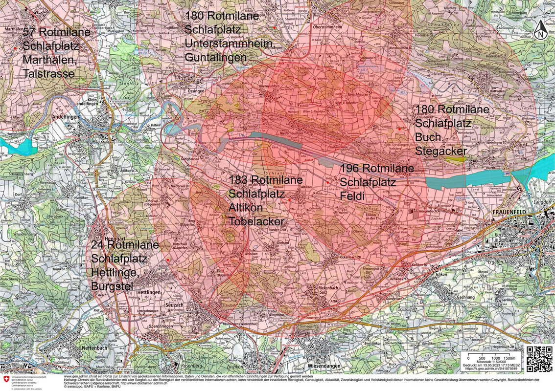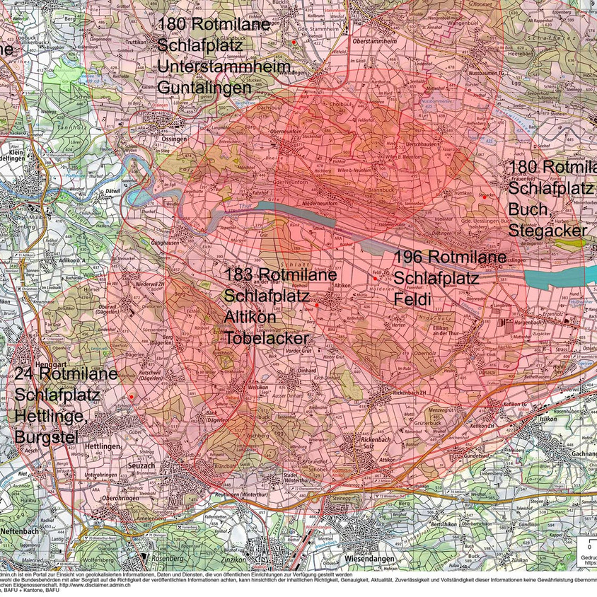 Die Schlafplätze in Altikon (Feldi und Töbeli) lassen bei einem Radius von 5km weder Anlagen im Schlattwald (Potentialgebiet Nr. 11), noch im Rickenbacher Oberholz (Potentialgebiet Nr. 13) zu. Ebenso sind die Potentialgebiete 10, 12 und 14 im Interessenskonflikt mit Schlafplätzen >100 Rotmilane.